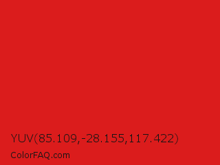 YUV 85.109,-28.155,117.422 Color is a normal red color and the nearest color is Maximum Red #d92121. Hex code #db1c1c and RGB value is rgb(219,28,28). In RGB color space, this color is composed of 86% red, 11% green, 11% blue, In CMYK color space, this color is composed of 0% cyan, 87% magenta, 87% yellow , 14% black , In HSL color space, this color has a hue angle of 0° , 77% saturation and 48% lightness.