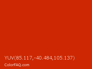 YUV 85.117,-40.484,105.137 Color is a normal red color and the nearest color is Thunderbird #c02b18. Hex code #cd2803 and RGB value is rgb(205,40,3). In RGB color space, this color is composed of 80% red, 16% green, 1% blue, In CMYK color space, this color is composed of 0% cyan, 80% magenta, 99% yellow , 20% black , In HSL color space, this color has a hue angle of 11° , 97% saturation and 41% lightness.
