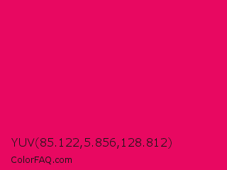 YUV 85.122,5.856,128.812 Color is a normal rose color and the nearest color is Raspberry #e30b5d. Hex code #e80861 and RGB value is rgb(232,8,97). In RGB color space, this color is composed of 91% red, 3% green, 38% blue, In CMYK color space, this color is composed of 0% cyan, 97% magenta, 58% yellow , 9% black , In HSL color space, this color has a hue angle of 336° , 93% saturation and 47% lightness.