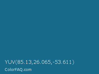 YUV 85.13,26.065,-53.611 Color is a normal blue color and the nearest color is Blue Sapphire #126180. Hex code #186a8a and RGB value is rgb(24,106,138). In RGB color space, this color is composed of 9% red, 42% green, 54% blue, In CMYK color space, this color is composed of 83% cyan, 23% magenta, 0% yellow , 46% black , In HSL color space, this color has a hue angle of 197° , 70% saturation and 32% lightness.