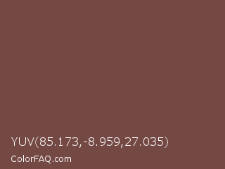 YUV 85.173,-8.959,27.035 Color is a normal red color and the nearest color is Roast Coffee #704241. Hex code #744943 and RGB value is rgb(116,73,67). In RGB color space, this color is composed of 45% red, 29% green, 26% blue, In CMYK color space, this color is composed of 0% cyan, 37% magenta, 42% yellow , 55% black , In HSL color space, this color has a hue angle of 7° , 27% saturation and 36% lightness.