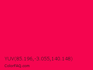YUV 85.196,-3.055,140.148 Color is a normal rose color and the nearest color is Folly #ff004f. Hex code #f5054f and RGB value is rgb(245,5,79). In RGB color space, this color is composed of 96% red, 2% green, 31% blue, In CMYK color space, this color is composed of 0% cyan, 98% magenta, 68% yellow , 4% black , In HSL color space, this color has a hue angle of 342° , 96% saturation and 49% lightness.