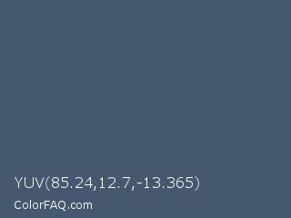 YUV 85.24,12.7,-13.365 Color is a normal blue color and the nearest color is Independence #4c516d. Hex code #46586f and RGB value is rgb(70,88,111). In RGB color space, this color is composed of 27% red, 35% green, 44% blue, In CMYK color space, this color is composed of 37% cyan, 21% magenta, 0% yellow , 56% black , In HSL color space, this color has a hue angle of 214° , 23% saturation and 35% lightness.