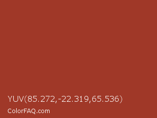 YUV 85.272,-22.319,65.536 Color is a normal red color and the nearest color is Prairie Sand #9a3820. Hex code #a03828 and RGB value is rgb(160,56,40). In RGB color space, this color is composed of 63% red, 22% green, 16% blue, In CMYK color space, this color is composed of 0% cyan, 65% magenta, 75% yellow , 37% black , In HSL color space, this color has a hue angle of 8° , 60% saturation and 39% lightness.