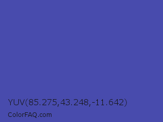 YUV 85.275,43.248,-11.642 Color is a normal blue color and the nearest color is Ocean Blue #4f42b5. Hex code #484bad and RGB value is rgb(72,75,173). In RGB color space, this color is composed of 28% red, 29% green, 68% blue, In CMYK color space, this color is composed of 58% cyan, 57% magenta, 0% yellow , 32% black , In HSL color space, this color has a hue angle of 238° , 41% saturation and 48% lightness.