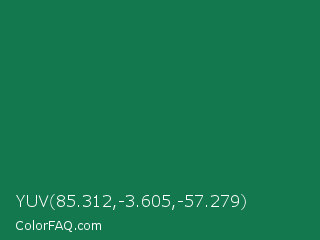 YUV 85.312,-3.605,-57.279 Color is a dark green color and the nearest color is Dark Spring Green #177245. Hex code #14784e and RGB value is rgb(20,120,78). In RGB color space, this color is composed of 8% red, 47% green, 31% blue, In CMYK color space, this color is composed of 83% cyan, 0% magenta, 35% yellow , 53% black , In HSL color space, this color has a hue angle of 155° , 71% saturation and 27% lightness.