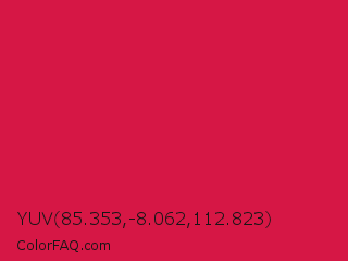 YUV 85.353,-8.062,112.823 Color is a normal red color and the nearest color is Crimson #dc143c. Hex code #d61745 and RGB value is rgb(214,23,69). In RGB color space, this color is composed of 84% red, 9% green, 27% blue, In CMYK color space, this color is composed of 0% cyan, 89% magenta, 68% yellow , 16% black , In HSL color space, this color has a hue angle of 346° , 81% saturation and 46% lightness.