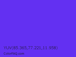 YUV 85.365,77.221,11.958 Color is a normal indigo color and the nearest color is Han Purple #5218fa. Hex code #6330f2 and RGB value is rgb(99,48,242). In RGB color space, this color is composed of 39% red, 19% green, 95% blue, In CMYK color space, this color is composed of 59% cyan, 80% magenta, 0% yellow , 5% black , In HSL color space, this color has a hue angle of 256° , 88% saturation and 57% lightness.