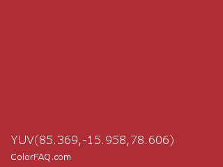 YUV 85.369,-15.958,78.606 Color is a normal red color and the nearest color is Well Read #b43332. Hex code #af2e35 and RGB value is rgb(175,46,53). In RGB color space, this color is composed of 69% red, 18% green, 21% blue, In CMYK color space, this color is composed of 0% cyan, 74% magenta, 70% yellow , 31% black , In HSL color space, this color has a hue angle of 357° , 58% saturation and 43% lightness.