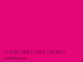 YUV 85.385,17.065,126.827 Color is a normal rose color and the nearest color is Red Purple #e40078. Hex code #e60578 and RGB value is rgb(230,5,120). In RGB color space, this color is composed of 90% red, 2% green, 47% blue, In CMYK color space, this color is composed of 0% cyan, 98% magenta, 48% yellow , 10% black , In HSL color space, this color has a hue angle of 329° , 96% saturation and 46% lightness.