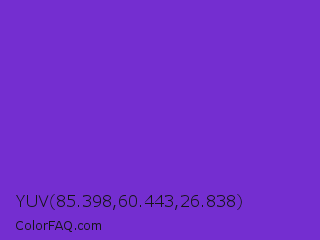YUV 85.398,60.443,26.838 Color is a normal violet color and the nearest color is Purple Heart Crayola #652dc1. Hex code #742ed0 and RGB value is rgb(116,46,208). In RGB color space, this color is composed of 45% red, 18% green, 82% blue, In CMYK color space, this color is composed of 44% cyan, 78% magenta, 0% yellow , 18% black , In HSL color space, this color has a hue angle of 266° , 64% saturation and 50% lightness.