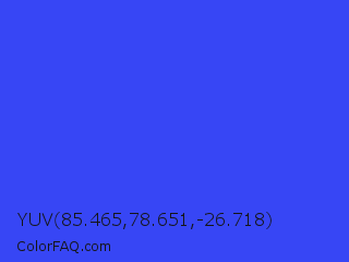 YUV 85.465,78.651,-26.718 Color is a normal blue color and the nearest color is Palatinate Blue #273be2. Hex code #3746f5 and RGB value is rgb(55,70,245). In RGB color space, this color is composed of 22% red, 27% green, 96% blue, In CMYK color space, this color is composed of 78% cyan, 71% magenta, 0% yellow , 4% black , In HSL color space, this color has a hue angle of 235° , 90% saturation and 59% lightness.