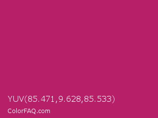 YUV 85.471,9.628,85.533 Color is a normal rose color and the nearest color is Hibiscus #b6316c. Hex code #b72069 and RGB value is rgb(183,32,105). In RGB color space, this color is composed of 72% red, 13% green, 41% blue, In CMYK color space, this color is composed of 0% cyan, 83% magenta, 43% yellow , 28% black , In HSL color space, this color has a hue angle of 331° , 70% saturation and 42% lightness.
