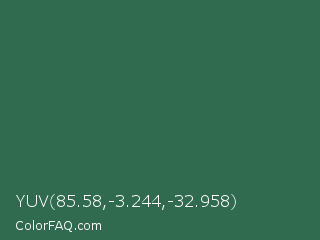 YUV 85.58,-3.244,-32.958 Color is a dark green color and the nearest color is Killarney #3a6a47. Hex code #306a4f and RGB value is rgb(48,106,79). In RGB color space, this color is composed of 19% red, 42% green, 31% blue, In CMYK color space, this color is composed of 55% cyan, 0% magenta, 25% yellow , 58% black , In HSL color space, this color has a hue angle of 152° , 38% saturation and 30% lightness.