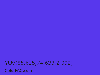 YUV 85.615,74.633,2.092 Color is a normal indigo color and the nearest color is Majorelle Blue #6050dc. Hex code #5837ed and RGB value is rgb(88,55,237). In RGB color space, this color is composed of 35% red, 22% green, 93% blue, In CMYK color space, this color is composed of 63% cyan, 77% magenta, 0% yellow , 7% black , In HSL color space, this color has a hue angle of 251° , 83% saturation and 57% lightness.
