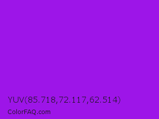 YUV 85.718,72.117,62.514 Color is a normal purple color and the nearest color is Veronica #a020f0. Hex code #9d15e8 and RGB value is rgb(157,21,232). In RGB color space, this color is composed of 62% red, 8% green, 91% blue, In CMYK color space, this color is composed of 32% cyan, 91% magenta, 0% yellow , 9% black , In HSL color space, this color has a hue angle of 279° , 83% saturation and 50% lightness.