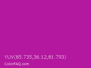 YUV 85.735,36.12,81.793 Color is a normal magenta color and the nearest color is Violet Eggplant #991199. Hex code #b3189f and RGB value is rgb(179,24,159). In RGB color space, this color is composed of 70% red, 9% green, 62% blue, In CMYK color space, this color is composed of 0% cyan, 87% magenta, 11% yellow , 30% black , In HSL color space, this color has a hue angle of 308° , 76% saturation and 40% lightness.