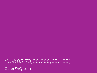 YUV 85.73,30.206,65.135 Color is a normal magenta color and the nearest color is Violet Eggplant #991199. Hex code #a02493 and RGB value is rgb(160,36,147). In RGB color space, this color is composed of 63% red, 14% green, 58% blue, In CMYK color space, this color is composed of 0% cyan, 78% magenta, 8% yellow , 37% black , In HSL color space, this color has a hue angle of 306° , 63% saturation and 38% lightness.