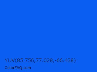 YUV 85.756,77.028,-66.438 Color is a normal blue color and the nearest color is Blue Ribbon #0066ff. Hex code #0a5ef2 and RGB value is rgb(10,94,242). In RGB color space, this color is composed of 4% red, 37% green, 95% blue, In CMYK color space, this color is composed of 96% cyan, 61% magenta, 0% yellow , 5% black , In HSL color space, this color has a hue angle of 218° , 92% saturation and 49% lightness.