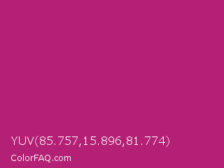 YUV 85.757,15.896,81.774 Color is a normal magenta color and the nearest color is Hibiscus #b6316c. Hex code #b32076 and RGB value is rgb(179,32,118). In RGB color space, this color is composed of 70% red, 13% green, 46% blue, In CMYK color space, this color is composed of 0% cyan, 82% magenta, 34% yellow , 30% black , In HSL color space, this color has a hue angle of 325° , 70% saturation and 41% lightness.