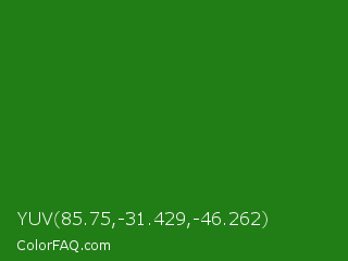 YUV 85.75,-31.429,-46.262 Color is a dark green color and the nearest color is Bilbao #327c14. Hex code #217d16 and RGB value is rgb(33,125,22). In RGB color space, this color is composed of 13% red, 49% green, 9% blue, In CMYK color space, this color is composed of 74% cyan, 0% magenta, 82% yellow , 51% black , In HSL color space, this color has a hue angle of 114° , 70% saturation and 29% lightness.