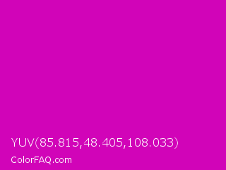YUV 85.815,48.405,108.033 Color is a normal magenta color and the nearest color is Deep Magenta #cc00cc. Hex code #d104b8 and RGB value is rgb(209,4,184). In RGB color space, this color is composed of 82% red, 2% green, 72% blue, In CMYK color space, this color is composed of 0% cyan, 98% magenta, 12% yellow , 18% black , In HSL color space, this color has a hue angle of 307° , 96% saturation and 42% lightness.