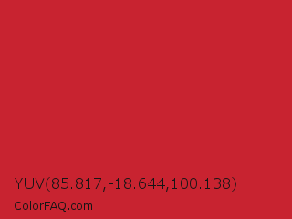 YUV 85.817,-18.644,100.138 Color is a normal red color and the nearest color is Fire Engine Red #ce2029. Hex code #c82330 and RGB value is rgb(200,35,48). In RGB color space, this color is composed of 78% red, 14% green, 19% blue, In CMYK color space, this color is composed of 0% cyan, 83% magenta, 76% yellow , 22% black , In HSL color space, this color has a hue angle of 355° , 70% saturation and 46% lightness.