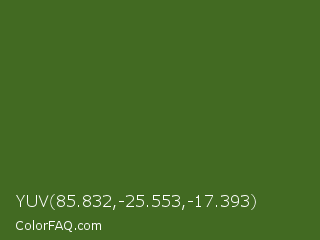 YUV 85.832,-25.553,-17.393 Color is a dark green color and the nearest color is Dark Moss Green #4a5d23. Hex code #426a22 and RGB value is rgb(66,106,34). In RGB color space, this color is composed of 26% red, 42% green, 13% blue, In CMYK color space, this color is composed of 38% cyan, 0% magenta, 68% yellow , 58% black , In HSL color space, this color has a hue angle of 93° , 51% saturation and 27% lightness.