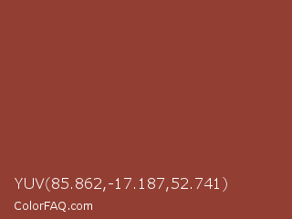 YUV 85.862,-17.187,52.741 Color is a normal red color and the nearest color is El Salva #8f3e33. Hex code #923e33 and RGB value is rgb(146,62,51). In RGB color space, this color is composed of 57% red, 24% green, 20% blue, In CMYK color space, this color is composed of 0% cyan, 58% magenta, 65% yellow , 43% black , In HSL color space, this color has a hue angle of 7° , 48% saturation and 39% lightness.