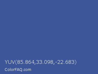 YUV 85.864,33.098,-22.683 Color is a normal blue color and the nearest color is Azure #315ba1. Hex code #3c5699 and RGB value is rgb(60,86,153). In RGB color space, this color is composed of 24% red, 34% green, 60% blue, In CMYK color space, this color is composed of 61% cyan, 44% magenta, 0% yellow , 40% black , In HSL color space, this color has a hue angle of 223° , 44% saturation and 42% lightness.
