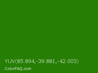 YUV 85.894,-39.881,-42.003 Color is a dark green color and the nearest color is Napier Green #2a8000. Hex code #267e05 and RGB value is rgb(38,126,5). In RGB color space, this color is composed of 15% red, 49% green, 2% blue, In CMYK color space, this color is composed of 70% cyan, 0% magenta, 96% yellow , 51% black , In HSL color space, this color has a hue angle of 104° , 92% saturation and 26% lightness.