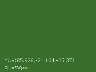 YUV 85.928,-21.164,-25.37 Color is a dark green color and the nearest color is Mughal Green #306030. Hex code #396d2b and RGB value is rgb(57,109,43). In RGB color space, this color is composed of 22% red, 43% green, 17% blue, In CMYK color space, this color is composed of 48% cyan, 0% magenta, 61% yellow , 57% black , In HSL color space, this color has a hue angle of 107° , 43% saturation and 30% lightness.
