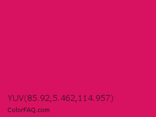 YUV 85.92,5.462,114.957 Color is a normal rose color and the nearest color is Ruby #e0115f. Hex code #d91161 and RGB value is rgb(217,17,97). In RGB color space, this color is composed of 85% red, 7% green, 38% blue, In CMYK color space, this color is composed of 0% cyan, 92% magenta, 55% yellow , 15% black , In HSL color space, this color has a hue angle of 336° , 85% saturation and 46% lightness.