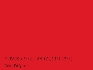 YUV 85.972,-23.65,119.297 Color is a normal red color and the nearest color is Maximum Red #d92121. Hex code #de1a26 and RGB value is rgb(222,26,38). In RGB color space, this color is composed of 87% red, 10% green, 15% blue, In CMYK color space, this color is composed of 0% cyan, 88% magenta, 83% yellow , 13% black , In HSL color space, this color has a hue angle of 356° , 79% saturation and 49% lightness.