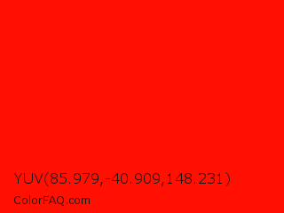 YUV 85.979,-40.909,148.231 Color is a normal red color and the nearest color is Candy Apple Red #ff0800. Hex code #ff1003 and RGB value is rgb(255,16,3). In RGB color space, this color is composed of 100% red, 6% green, 1% blue, In CMYK color space, this color is composed of 0% cyan, 94% magenta, 99% yellow , 0% black , In HSL color space, this color has a hue angle of 3° , 100% saturation and 51% lightness.