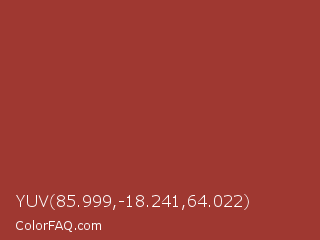 YUV 85.999,-18.241,64.022 Color is a normal red color and the nearest color is Stiletto #9c3336. Hex code #9f3831 and RGB value is rgb(159,56,49). In RGB color space, this color is composed of 62% red, 22% green, 19% blue, In CMYK color space, this color is composed of 0% cyan, 65% magenta, 69% yellow , 38% black , In HSL color space, this color has a hue angle of 4° , 53% saturation and 41% lightness.