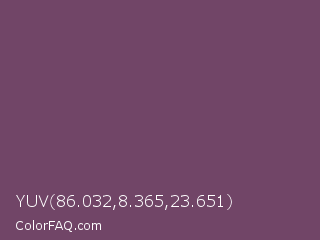 YUV 86.032,8.365,23.651 Color is a normal magenta color and the nearest color is Cosmic #76395d. Hex code #714567 and RGB value is rgb(113,69,103). In RGB color space, this color is composed of 44% red, 27% green, 40% blue, In CMYK color space, this color is composed of 0% cyan, 39% magenta, 9% yellow , 56% black , In HSL color space, this color has a hue angle of 314° , 24% saturation and 36% lightness.