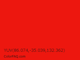 YUV 86.074,-35.039,132.362 Color is a normal red color and the nearest color is Vivid Red #f70d1a. Hex code #ed170f and RGB value is rgb(237,23,15). In RGB color space, this color is composed of 93% red, 9% green, 6% blue, In CMYK color space, this color is composed of 0% cyan, 90% magenta, 94% yellow , 7% black , In HSL color space, this color has a hue angle of 2° , 88% saturation and 49% lightness.