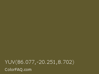 YUV 86.077,-20.251,8.702 Color is a dark yellow color and the nearest color is Costa Del Sol #615d30. Hex code #60592d and RGB value is rgb(96,89,45). In RGB color space, this color is composed of 38% red, 35% green, 18% blue, In CMYK color space, this color is composed of 0% cyan, 7% magenta, 53% yellow , 62% black , In HSL color space, this color has a hue angle of 52° , 36% saturation and 28% lightness.