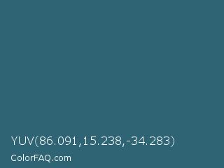 YUV 86.091,15.238,-34.283 Color is a normal blue color and the nearest color is Casal #2f6168. Hex code #2f6475 and RGB value is rgb(47,100,117). In RGB color space, this color is composed of 18% red, 39% green, 46% blue, In CMYK color space, this color is composed of 60% cyan, 15% magenta, 0% yellow , 54% black , In HSL color space, this color has a hue angle of 195° , 43% saturation and 32% lightness.