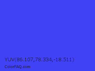 YUV 86.107,78.334,-18.511 Color is a light blue color and the nearest color is Palatinate Blue #273be2. Hex code #4142f5 and RGB value is rgb(65,66,245). In RGB color space, this color is composed of 25% red, 26% green, 96% blue, In CMYK color space, this color is composed of 73% cyan, 73% magenta, 0% yellow , 4% black , In HSL color space, this color has a hue angle of 240° , 90% saturation and 61% lightness.