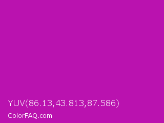 YUV 86.13,43.813,87.586 Color is a normal magenta color and the nearest color is Heliotrope Magenta #aa00bb. Hex code #ba12af and RGB value is rgb(186,18,175). In RGB color space, this color is composed of 73% red, 7% green, 69% blue, In CMYK color space, this color is composed of 0% cyan, 90% magenta, 6% yellow , 27% black , In HSL color space, this color has a hue angle of 304° , 82% saturation and 40% lightness.