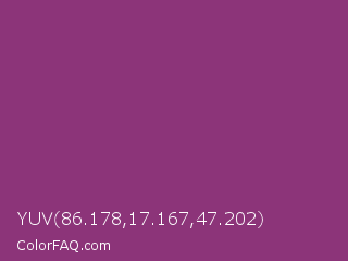 YUV 86.178,17.167,47.202 Color is a normal magenta color and the nearest color is Razzmic Berry Crayola #843179. Hex code #8c3479 and RGB value is rgb(140,52,121). In RGB color space, this color is composed of 55% red, 20% green, 47% blue, In CMYK color space, this color is composed of 0% cyan, 63% magenta, 14% yellow , 45% black , In HSL color space, this color has a hue angle of 313° , 46% saturation and 38% lightness.