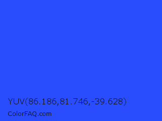 YUV 86.186,81.746,-39.628 Color is a normal blue color and the nearest color is Palatinate Blue #273be2. Hex code #294dfc and RGB value is rgb(41,77,252). In RGB color space, this color is composed of 16% red, 30% green, 99% blue, In CMYK color space, this color is composed of 84% cyan, 69% magenta, 0% yellow , 1% black , In HSL color space, this color has a hue angle of 230° , 97% saturation and 57% lightness.