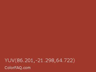 YUV 86.201,-21.298,64.722 Color is a normal red color and the nearest color is Sweet Brown #a83731. Hex code #a0392b and RGB value is rgb(160,57,43). In RGB color space, this color is composed of 63% red, 22% green, 17% blue, In CMYK color space, this color is composed of 0% cyan, 64% magenta, 73% yellow , 37% black , In HSL color space, this color has a hue angle of 7° , 58% saturation and 40% lightness.