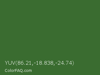 YUV 86.21,-18.838,-24.74 Color is a normal green color and the nearest color is Mughal Green #306030. Hex code #3a6c30 and RGB value is rgb(58,108,48). In RGB color space, this color is composed of 23% red, 42% green, 19% blue, In CMYK color space, this color is composed of 46% cyan, 0% magenta, 56% yellow , 58% black , In HSL color space, this color has a hue angle of 110° , 38% saturation and 31% lightness.
