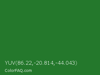 YUV 86.22,-20.814,-44.043 Color is a normal green color and the nearest color is Forest Green #228b22. Hex code #24782c and RGB value is rgb(36,120,44). In RGB color space, this color is composed of 14% red, 47% green, 17% blue, In CMYK color space, this color is composed of 70% cyan, 0% magenta, 63% yellow , 53% black , In HSL color space, this color has a hue angle of 126° , 54% saturation and 31% lightness.