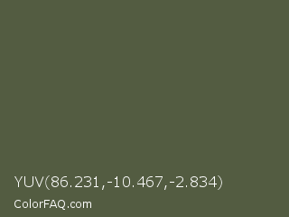 YUV 86.231,-10.467,-2.834 Color is a normal green color and the nearest color is Hemlock #5e5d3b. Hex code #535c41 and RGB value is rgb(83,92,65). In RGB color space, this color is composed of 33% red, 36% green, 25% blue, In CMYK color space, this color is composed of 10% cyan, 0% magenta, 29% yellow , 64% black , In HSL color space, this color has a hue angle of 80° , 17% saturation and 31% lightness.