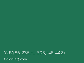 YUV 86.236,-1.595,-48.442 Color is a dark green color and the nearest color is Dark Spring Green #177245. Hex code #1f7353 and RGB value is rgb(31,115,83). In RGB color space, this color is composed of 12% red, 45% green, 33% blue, In CMYK color space, this color is composed of 73% cyan, 0% magenta, 28% yellow , 55% black , In HSL color space, this color has a hue angle of 157° , 58% saturation and 29% lightness.