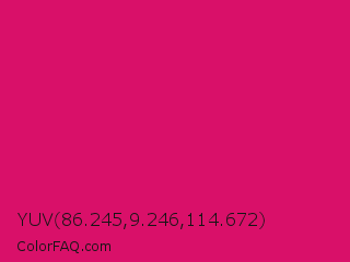 YUV 86.245,9.246,114.672 Color is a normal rose color and the nearest color is Dogwood Rose #d71868. Hex code #d91069 and RGB value is rgb(217,16,105). In RGB color space, this color is composed of 85% red, 6% green, 41% blue, In CMYK color space, this color is composed of 0% cyan, 93% magenta, 52% yellow , 15% black , In HSL color space, this color has a hue angle of 333° , 86% saturation and 46% lightness.